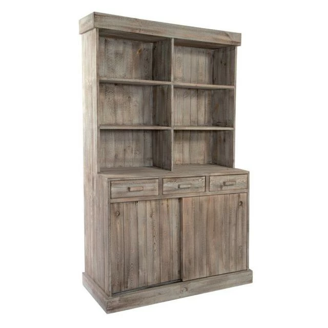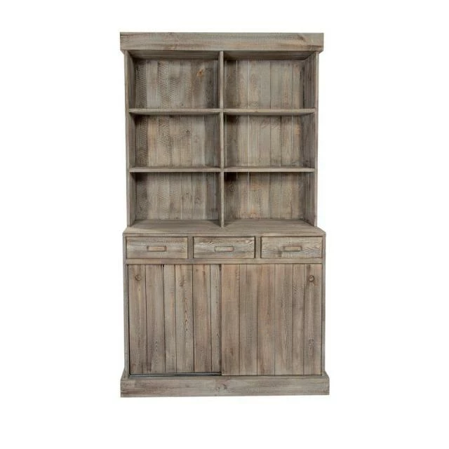Buffet vaisselier avec 3 étagères et 1 dans la partie inférieure. 3 tiroirs. Portes coulissantes.