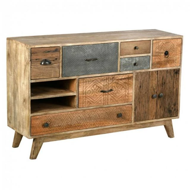 Commode asymétrique en manguier 7 tiroirs et 2 portes avec étagères. Façade en bois et métal sculptés à la main. Les poignées sont en métal.