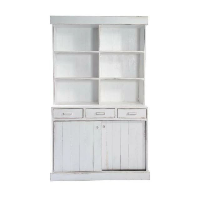Buffet vaisselier avec 3 étagères et 1 dans la partie inférieure. 3 tiroirs. Portes coulissantes.
