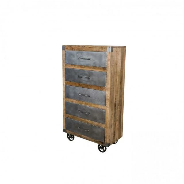 Semainier en zinc et bois ciré 5 tiroirs sur roulettes L78.5 X P41 X H140