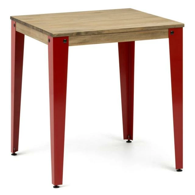 Table de salle à manger en style industriel vintage. Longueur 80cm x Profondeur 80cm x Hauteur de 75cm. Métal rouge, bois finition vieilli effect vintage. Conçue et fabriquée en Espagne par BOX FURNITURE.